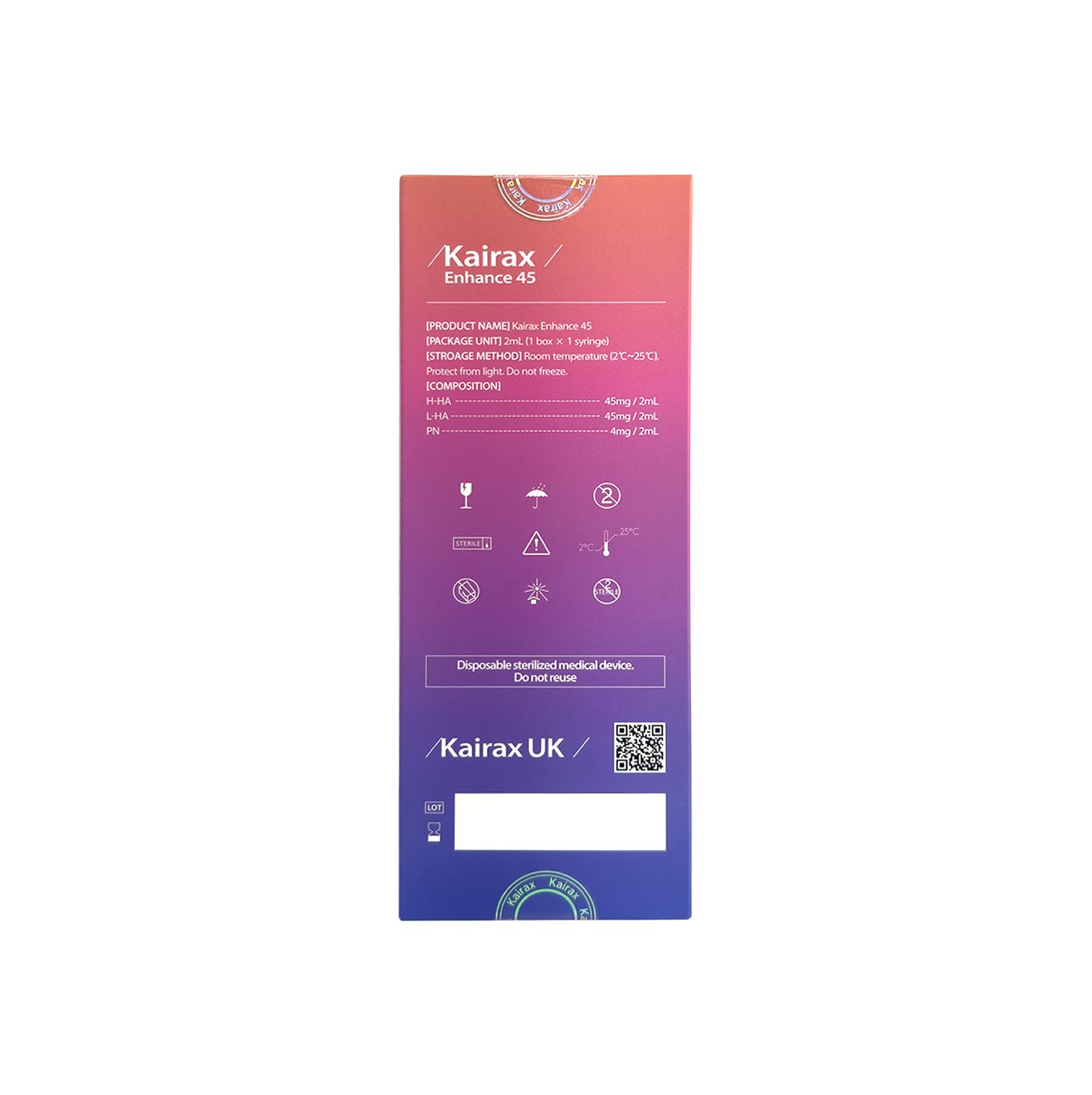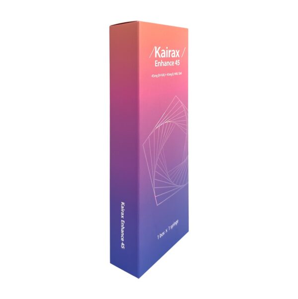 Kairax Enhance 45 is our new premium skin booster containing a total of 90mg of HA per (2ml) and 4mg of Polynucleotides per (2ml) KAIRAX Enhance 45 uses 45 high & 45 low Hyaluronic acid for enhancing results and performance. Providing a lipo lifting effect by restoring adipose tissue and leading to deep firmness.